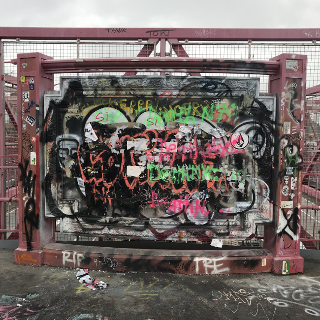 Each time I walk by this sign, I see it rocking a new signature, someone grabbing the focal point from the previous mark, with its own colors and lines. Fame, if only fleeting. As of June 2018, I've started cataloging them here, and you can see how it changes every few weeks.