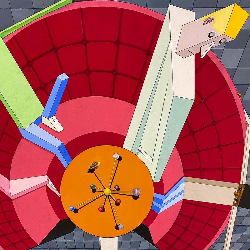 The subjects of Mernet Larsen's paintings live in a parallel universe, where everything is emotionless flat and rectangular, or takes a circular shape, with little space in between. Emotionless people go about their days, hanging in a diner, going to site-seeing spots, flying about the city, fixing planet-orbiting spacecraft. But the space boxily bends in around them, inviting a sense of vertigo.